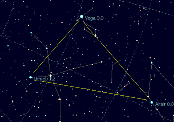 さらにアルタイルから東に向かって視線を上げていくと少し暗いですが一等星のデネブが確認できます。ベガとアルタイル、デネブを結んだこの三角形が有名な夏の大三角です。